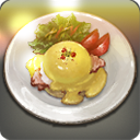 イシュガルドマフィンにスモークしたサーモンと湯通しした卵をのせ、オランデーズソースをかけた料理