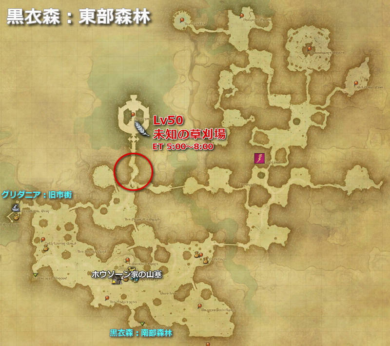 | 黒衣森 | 黒衣森:東部森林 | 未知の草刈場 | line:1 | Lv50 | (MAP) |