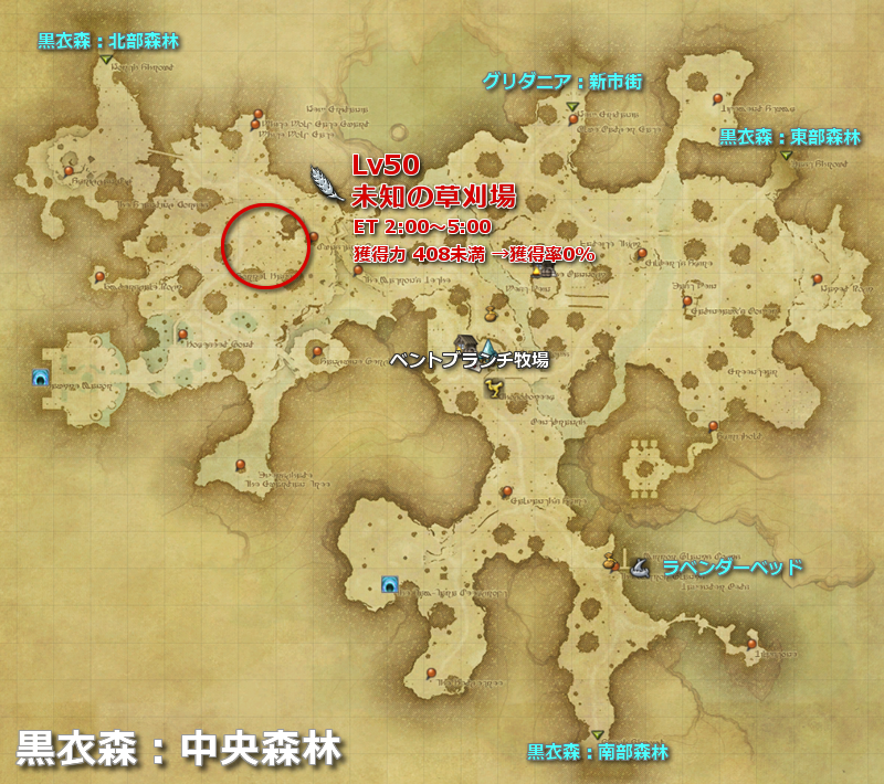 | 黒衣森 | 黒衣森:中央森林 | 未知の草刈場 | line:5 | Lv50 | (MAP) |