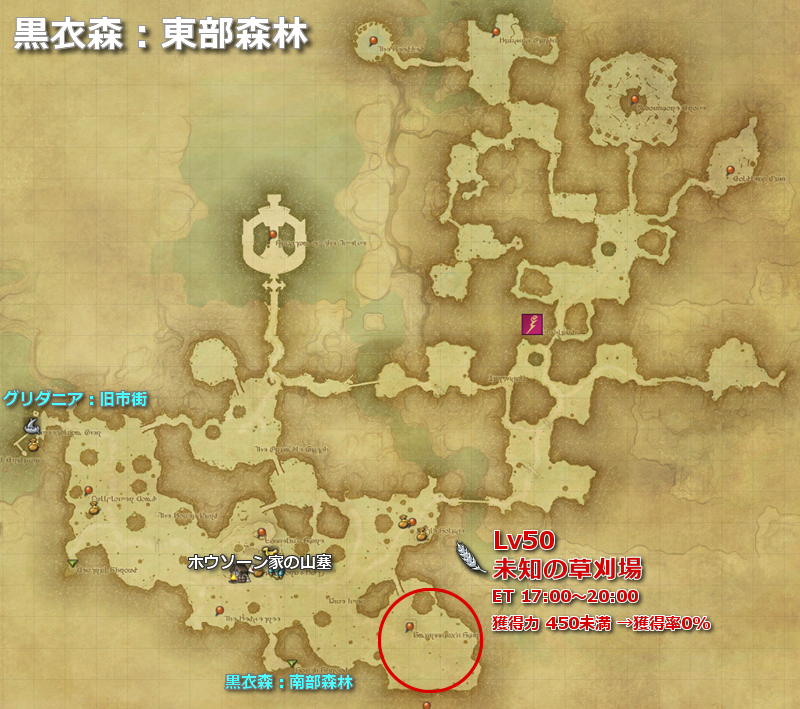 | 黒衣森 | 黒衣森:東部森林 | 未知の草刈場 | line:1 | Lv50 | (MAP) |