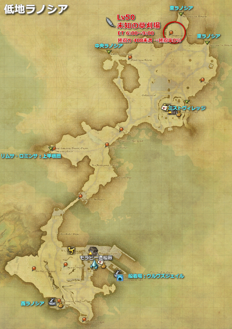 | ラノシア | 低地ラノシア | 未知の草刈場 | line:6 | Lv50 | (MAP) |