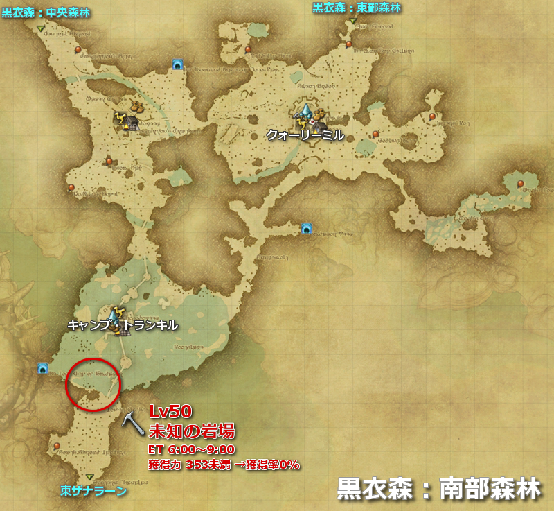 | 黒衣森 | 黒衣森:南部森林 | 未知の岩場 | line:7 | Lv50 | (MAP) |